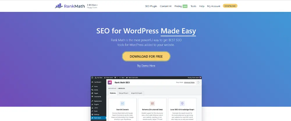 Rank Math is often called the “Swiss Army Knife of SEO plugins.” Launched in 2018, it has quickly gained popularity due to its lightweight design and extensive free features that rival premium competitors. Its AI-driven optimization and integration with Google Analytics and Search Console make it a powerful choice.
