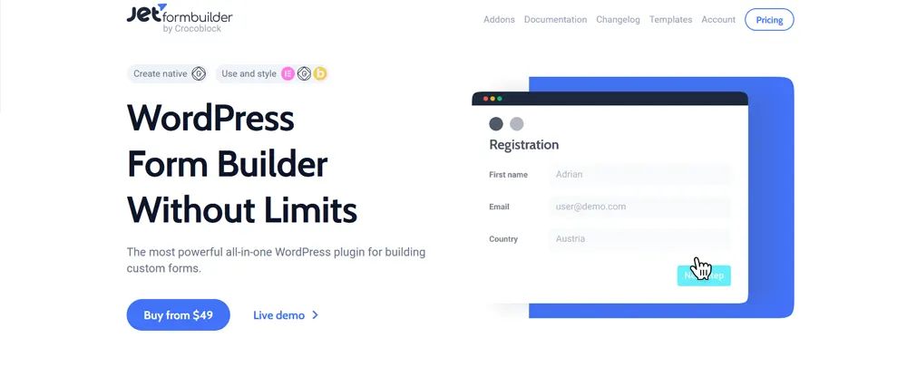 JetFormBuilder another web form plugins delivers advanced form functionality within the Gutenberg editor. It offers conditional logic, calculated fields, multi-step and multi-column layouts, and post-submit actions—all for free. With 19+ field types including file upload, WYSIWYG, and repeaters, it's among the deepest free offerings on modern WordPress platforms. Its layout mimics Gutenberg, making it intuitive for block-based designers. Paid add-ons unlock CRM or email integrations, but core features are highly generous free of cost.