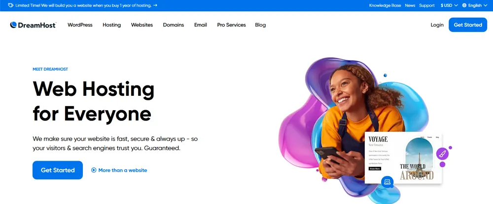 DreamHost has long been a favorite among developers and bloggers thanks to its transparent pricing, strong privacy policies, and generous refund guarantee. With SSD storage, unmetered bandwidth, and daily backups, it’s a solid choice for long-term reliability.